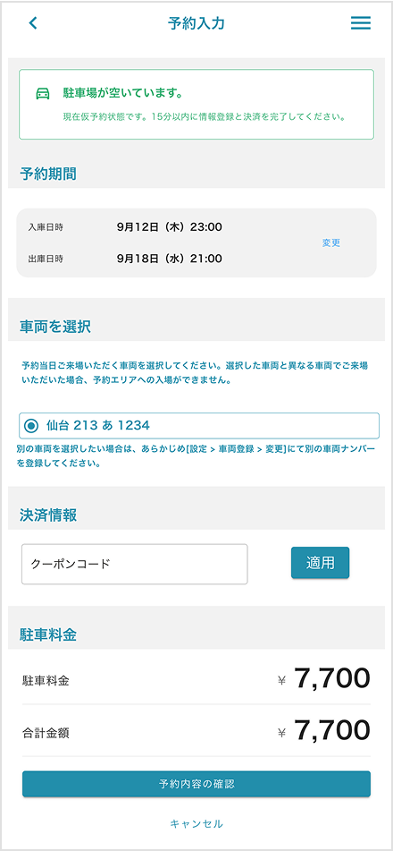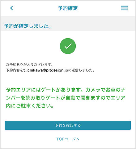 Webから簡単に駐車場を予約できます。空き状況を確認し、利用日時と車両ナンバーを入力するだけで、オンライン決済までスムーズに完了。予約確定後は、入庫時に登録ナンバーをカメラが自動認識し、ゲートが開いて入出庫できます。予約内容はマイページからいつでも確認・変更可能です。