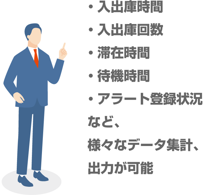入出庫時間や施設内の滞在時間を可視化。